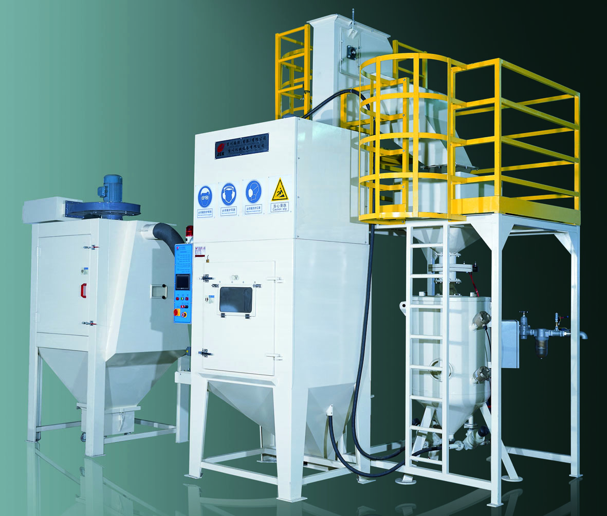2?丸料和壓縮空氣的混合過(guò)程 丸料和壓縮空氣的三種常見(jiàn)的混合系統(tǒng)是虹吸式系統(tǒng)、重力式系統(tǒng)和直接供料系統(tǒng)。 2.1虹吸式系統(tǒng) 該系統(tǒng)如圖6所示。由于壓縮空氣的速度v2比丸料輸送管道中的速度v1大的多,那么丸料輸送管道中的空氣會(huì)被吸入到壓縮空氣管道中,這就是“虹吸”這個(gè)詞的來(lái)源。由于v1小于v2,那么丸料輸送管道的空氣壓力要高于噴嘴中的壓力。伯努利解釋了這種現(xiàn)象,因此也稱(chēng)為伯努利定理。如果用p1表示丸料輸送系統(tǒng)中的壓力,用p2表示噴嘴中的壓力,那么我們可以得到: (p1-p2)=1/2.ρA.(v22-v12)?????? ?????????????????????(2)