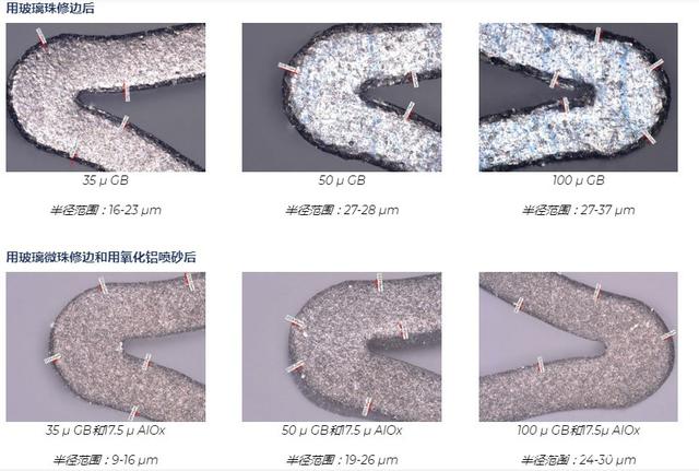 經(jīng)過吉川公司工藝工程師測試,用氧化鋁砂進行定向的噴砂處理可以去除氧化層,平滑表面缺陷并改善外圍支架的表面質(zhì)量。支架的受損區(qū)域很脆,但基礎(chǔ)材料鎳鈦諾卻具有延展性。氧化鋁噴砂磨料使用去氧化層,并且對韌性基體的侵蝕最小,從而在支架撐桿的整個長度上形成均勻的表面光潔度。 市場最新的支架設(shè)計和醫(yī)療植入物要求更大的邊緣倒圓角。圓形邊緣降低了被植入物卡住,其他風險的可能性。氧化鋁微噴丸的半徑為5-15 m,但新的幾何尺寸指定為接近25 m。該半徑可以通過三種途徑實現(xiàn):延長噴砂周期,使用更大尺寸的氧化鋁或完全使用其他磨料。通過測試,我們了解到更長的噴砂周期可以去除更多的團塊,而較大尺寸的氧化鋁會產(chǎn)生過于粗糙而無法拋光的表面。畢竟,氧化鋁顆粒的形狀為塊狀,邊緣稍尖。這給了我們一個可行的選擇:嘗試使用其他類型的磨料。為了克服這一障礙,我們測試了幾種類型的介質(zhì),發(fā)現(xiàn)用玻璃珠噴砂可以在拐角處形成所需的半徑(最大30 m),而不會除去設(shè)備的額外質(zhì)量。結(jié)果是氧化鋁的質(zhì)量提高了十倍。經(jīng)過吉川公司工藝工程師的測試事實說明了結(jié)果的差異。用氧化鋁噴砂處理過的樣品的半徑僅為8-13 m,而用玻璃珠噴砂處理過的樣品的半徑為24-30 m。 經(jīng)過吉川公司工藝工程師最終測試事實證明,最好的心臟支架噴砂工藝需要用氧化鋁砂粗噴砂、再用玻璃珠微噴砂是目前最好的一種噴砂工藝方式。 經(jīng)過粗噴、微噴的產(chǎn)品外徑和內(nèi)徑轉(zhuǎn)角處的半徑可以實現(xiàn),而所需的附加材料去除最少。半徑的大小可以有效地控制,因為它是基于圓形磨料,玻璃珠的大小和速度的??梢钥刂凭哂懈郊影霃降闹Ъ軈^(qū)域。通過機械加工表面,有助于保持支架的疲勞壽命。玻璃珠磨料通常用于必須保持嚴格公差的噴丸處理應用中。玻璃珠對支架表面進行噴丸處理,不會去除任何材料或數(shù)量可忽略不計的材料。如下所示,玻璃珠的尺寸很重要。玻璃珠的尺寸越大;邊緣越圓。玻璃珠有35 ,50 和100 兩種。讓我們看一下使用每種尺寸的樣本測試的結(jié)果。此處顯示的未噴砂的支架表面(500x)邊緣鋒利,并受到制造損壞。半徑范圍僅為3-8 m。為什么用兩種磨料處理比單獨用氧化鋁處理好? 玻璃珠無法消除制造過程中產(chǎn)生的浮渣,回彈和其他損壞;只有氧化鋁可以。氧化鋁不能產(chǎn)生真正的圓形邊緣。但是,它確實可以提供電拋光所需的理想表面光潔度。一個不能替代另一個。通過使用多步驟過程,植入物表面可以使用經(jīng)過驗證的相同設(shè)備獲得兩全其美的效果。在該過程中添加第二種研磨劑聽起來可能需要更多的勞動力,但實際上比其他修邊過程更有效。例如,電拋光可以產(chǎn)生較大的半徑,但它也會從整個零件中去除過多的材料,而不僅僅是角部,從而損害了支架的疲勞壽命。
