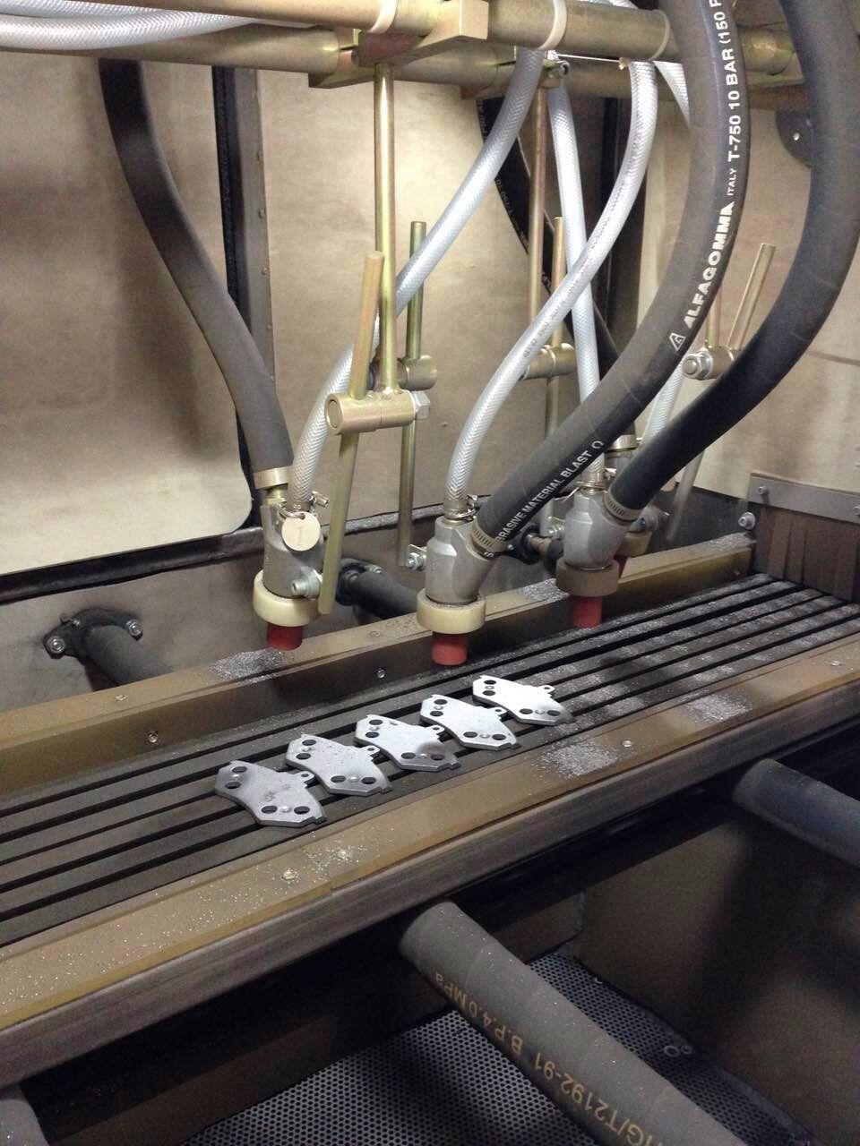 剎車片的生產(chǎn)過程中質(zhì)量尤為關(guān)鍵,其中最重要的一個(gè)生產(chǎn)環(huán)節(jié),鐵才與剎車片雛形粘合,粘合前需要通過自動(dòng)噴砂機(jī),才能有效的粘合。